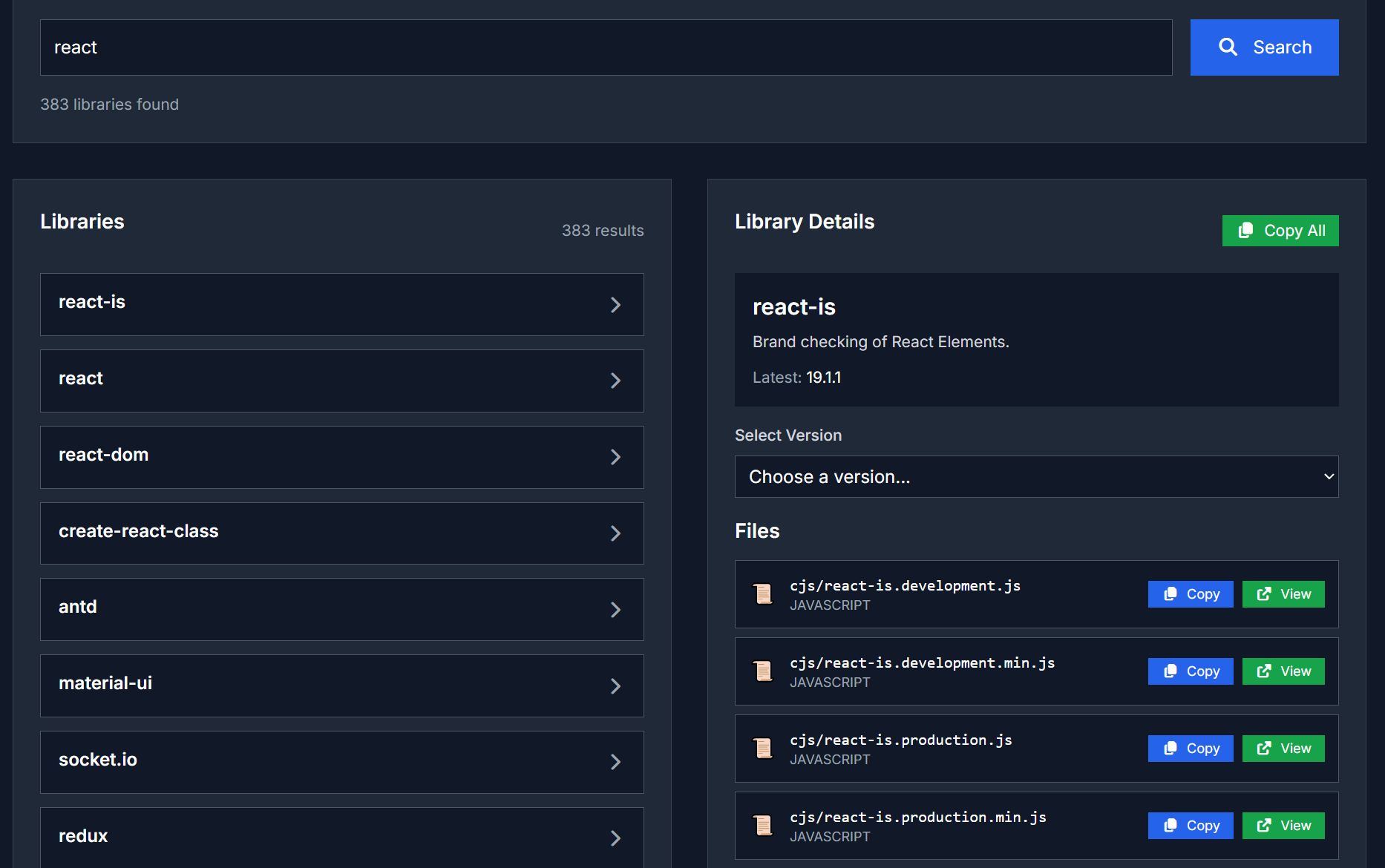 它的功能非常简单但实用:快速搜索各大前端库的 CDN 地址和可用版本。 只要输入一个包名,比如 vue、react、axios、three.js,它就会立刻列出多个常用 CDN 来源(jsDelivr、UNPKG、cdnjs 等),并且可以一键复制。 最重要的是,你可以看到各个版本的真实可用链接,避免 AI 给的那种 “虚构地址” 浪费调试时间。