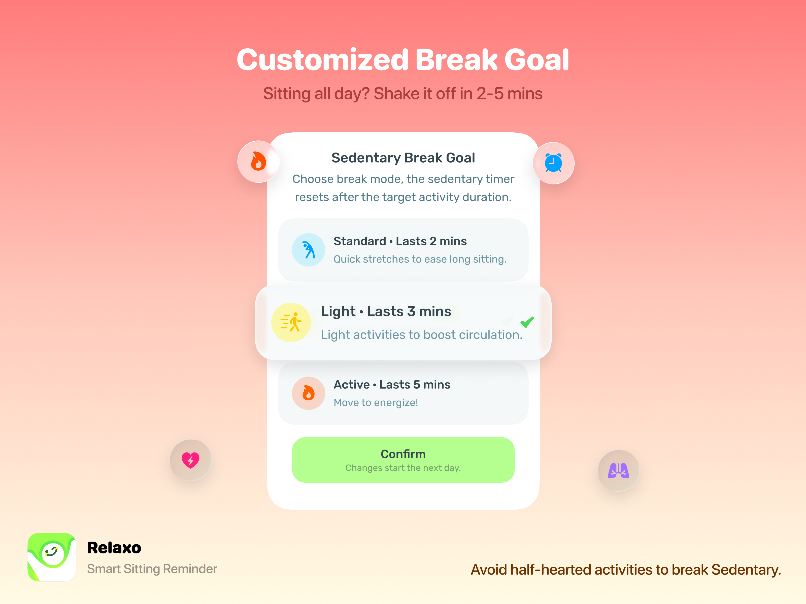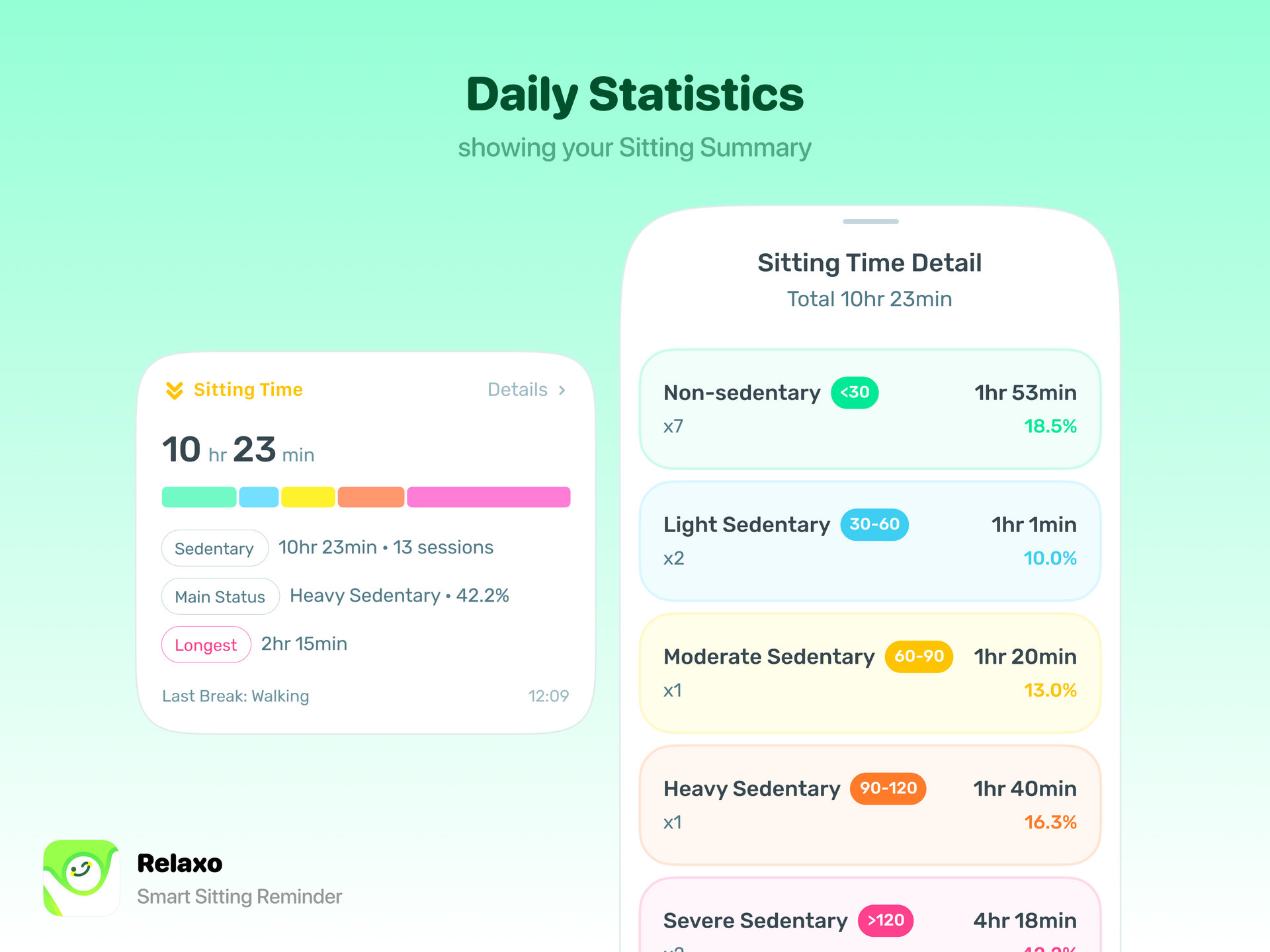自动记录久坐时间与提醒 – 一坐下就开始记录久坐时间,并在该起身时提醒你。你可以设置多个提醒,如果忽略最后一次,它会每 5–15 分钟持续提醒。 活动目标 – 久坐时间只有在真正完成活动目标时才会重置,短暂的零散动作不会误导系统。 户外 & 勿扰模式 – 自动切换到户外模式避免不必要提醒,同时支持小憩时的勿扰模式。 久坐数据洞察 – 查看每日久坐模式,更好地了解自己的身体习惯。
