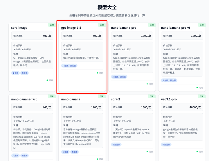 更多模型详情及最新定价,请直接查看 GrsAI 控制台模型列表:https://grsai.com/zh/dashboard/models 官方文档:https://grsai.com/zh/dashboard/documents/gpt-image