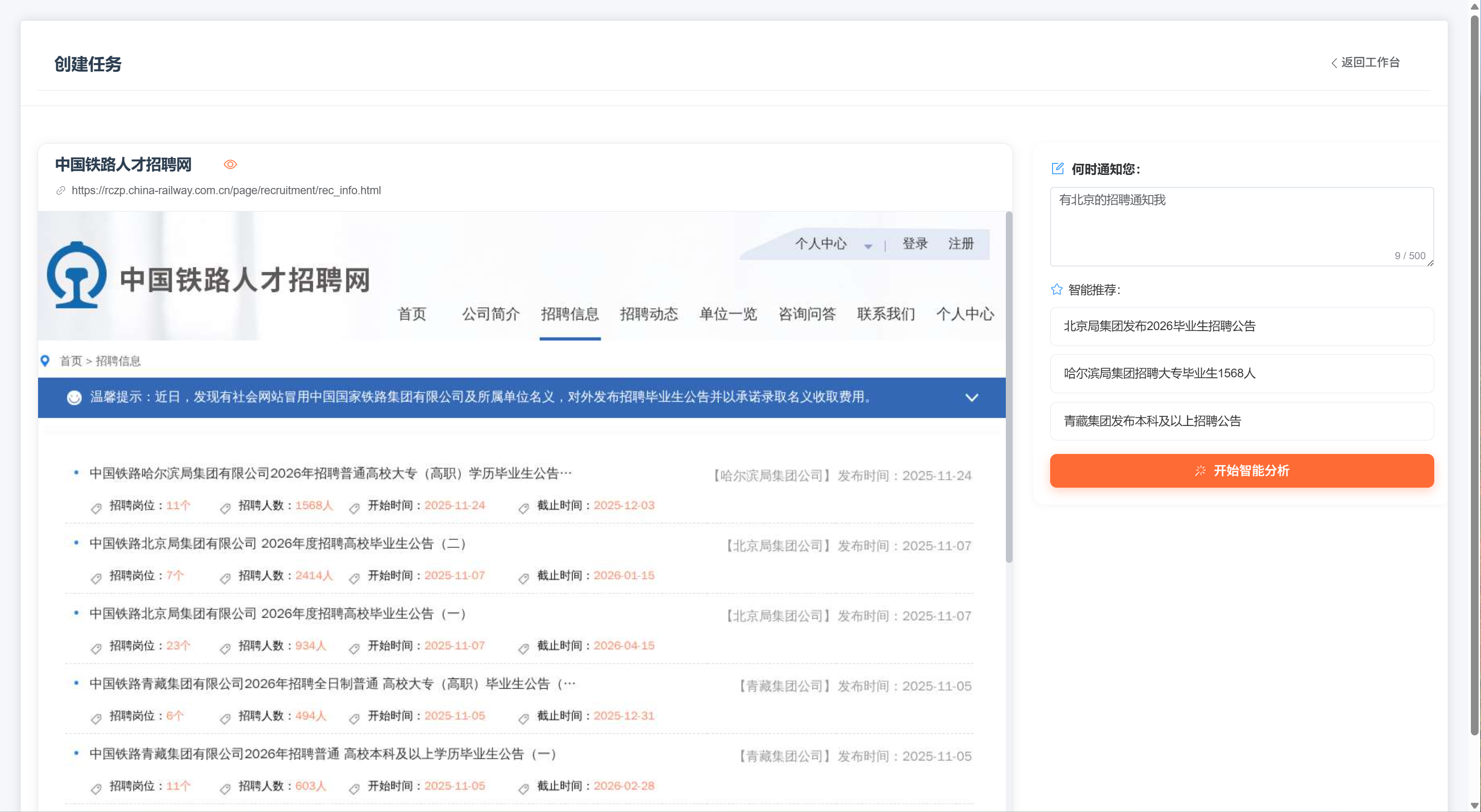 • 某事业单位的招聘公告页 URL + “有行政、文书类岗位的招聘公告,通知我”