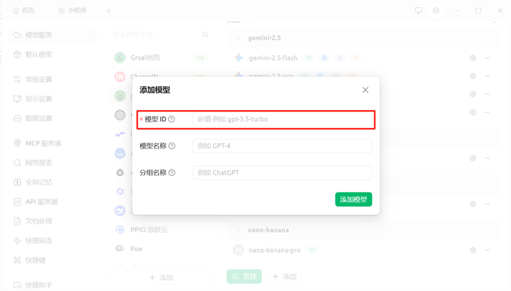2.添加模型服务:在设置菜单中,找到并点击 “模型服务” 点击添加,输入供应商名称(自定义随意写),模型提供商 OpenAI 和 Gemini 都支持。