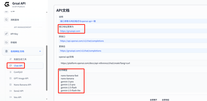下面是针对 Grsai 平台的详细配置步骤,跟着做基本 3-5 分钟就能用上 Gemini-3-Pro 和 Nano Banana Pro 等模型。最重要提醒:模型名称必须从 Grsai 官方开发文档(Chat API 部分)直接复制粘贴,千万不要自己手打!哪怕多一个空格或大小写不对,都会导致连接失败。