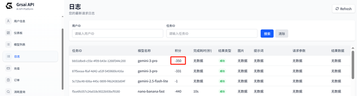 你不用付高额的订阅费用,也不用担心学生号被封。API 调用是按量付费,用多少付多少,普通用户/创作者用一年都用不到 \$199 。在 Grsai 后台 “日志” 中也能查看每条内容所产生的积分扣费,失败是否返回积分可以在模型列表中查看,每个模型均不同。