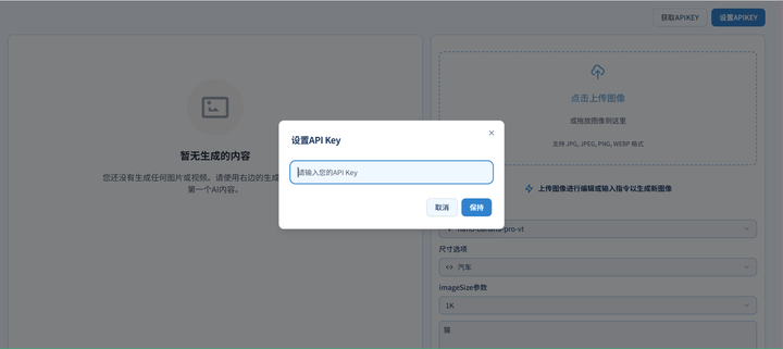 2.配置 API: 打开批量生图工具(image.grsai.com ) com 域名访问需要魔法,没有改成 ai),右上角设置 APIKey,黏贴你的 API Key
